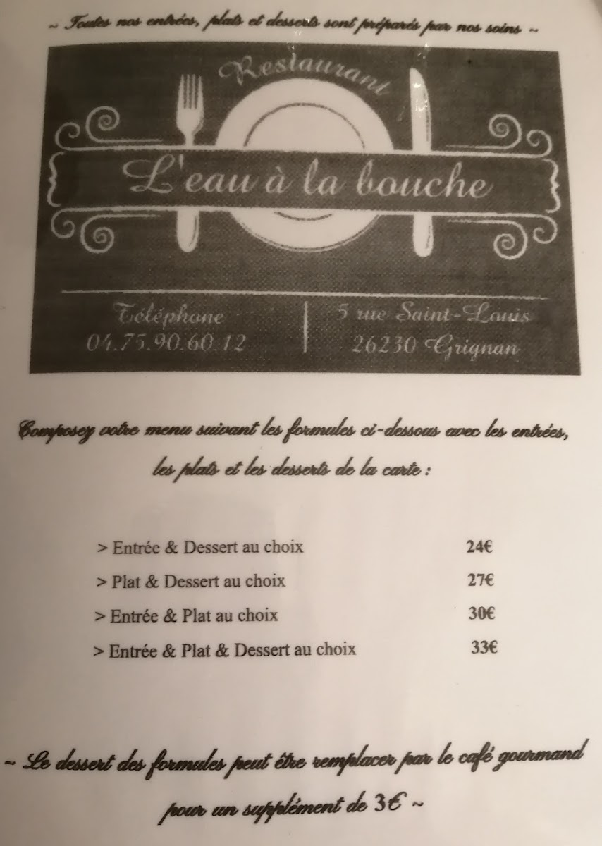 Welcome to Restaurant L'Eau à la Bouche, a charming culinary gem tucked away on Rue Saint-Louis in Grignan, France. This delightful eatery offers a carefully curated menu that reflects the essence of French cuisine, emphasizing fresh, local ingredients. The cozy ambiance, particularly enjoyed in the lovely patio, creates a warm atmosphere for diners.
